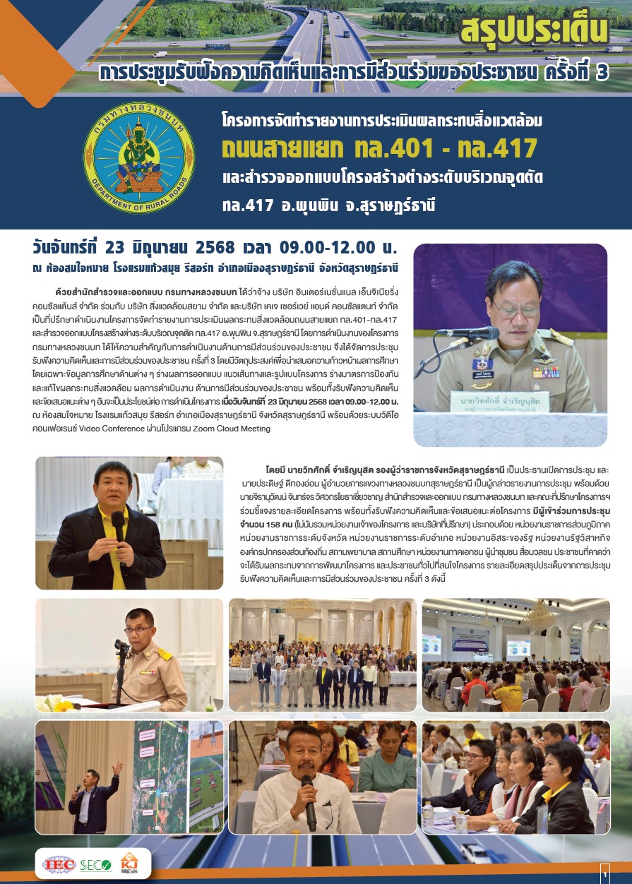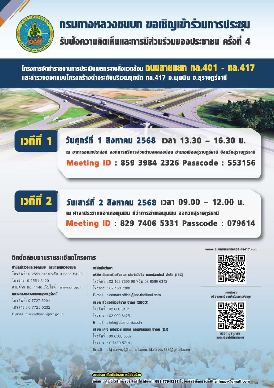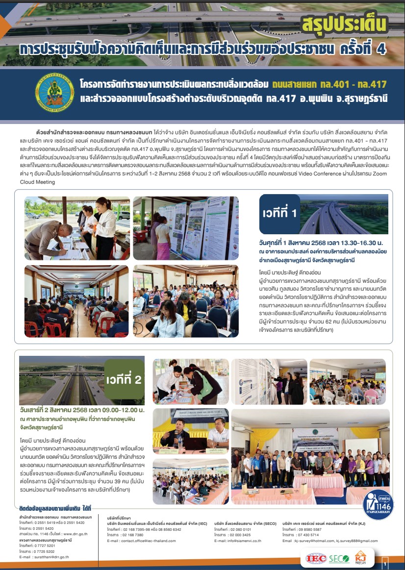 สำนักสำรวจและออกแบบ กรมทางหลวงชนบท กำหนดให้มีการประชุมรับฟังความคิดเห็นและการมีส่วนร่วมของประชาชน ครั้งที่ 4 เพื่อนำเสนอร่างแบบก่อสร้างมาตรการป้องกันและแก้ไขผลกระทบสิ่งแวดล้อมและมาตรการติดตามตรวจสอบผลกระทบสิ่งแวดล้อม และผลการดำเนินงานด้านการมีส่วนร่วมของประชาชน พร้อมทั้งรับฟังความคิดเห็น และข้อเสนอแนะต่าง ๆ อันจะเป็นประโยชน์ต่อการดำเนินโครงการ ระหว่างวันที่ 1-2 สิงหาคม 2568 จำนวน 2 เวที พร้อมด